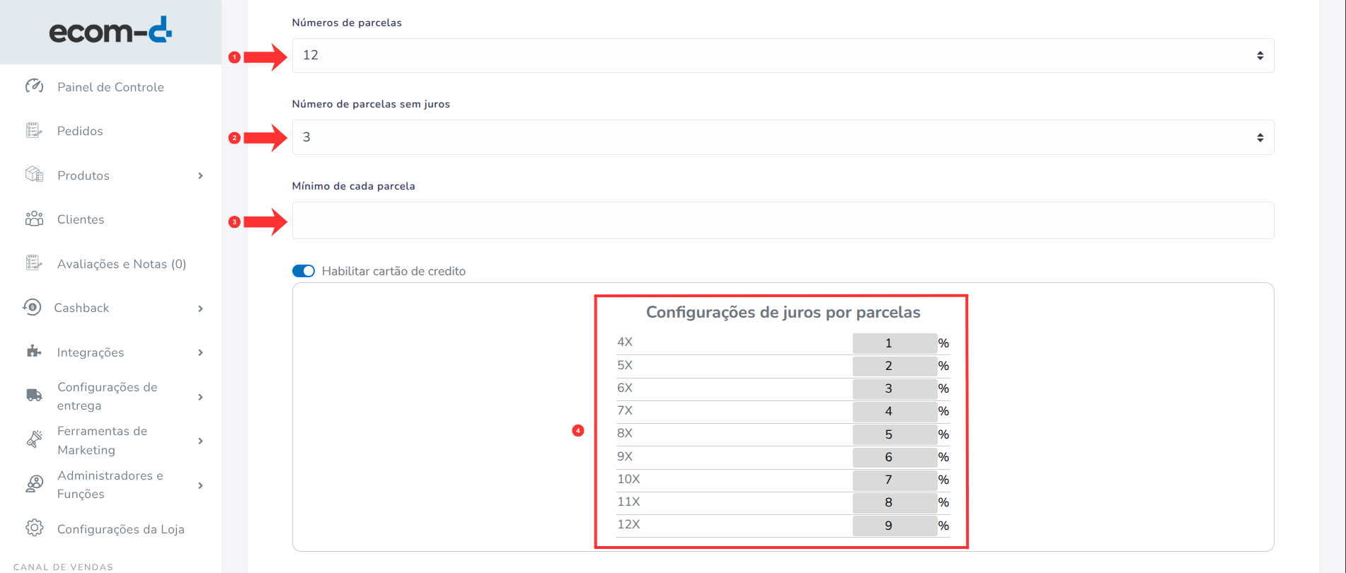 - Número de parcelas sem juros: Quantidade de parcelas que o cliente não vai precisar pagar o juros do parcelamento.