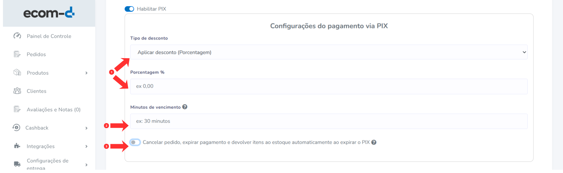 Para o PIX, também é possível configurar o tipo de desconto a ser aplicado. Quando essa opção estiver habilitada, você poderá definir: