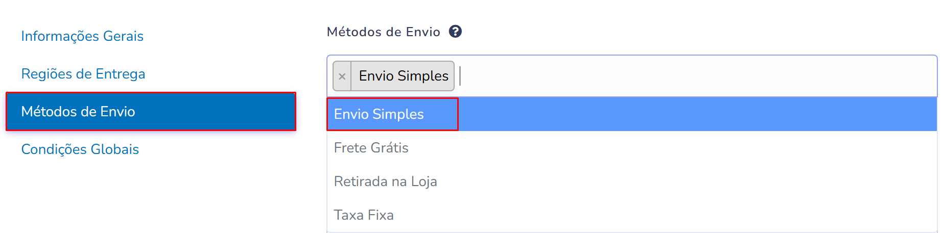 - Vá em métodos de Envio e marque a opção Envio Simples.