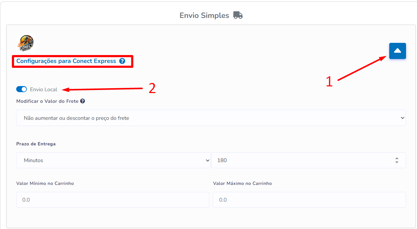 - Na aba Envio Simples nos métodos de envio, procure por Conect Express > Clique na seta para exibir as configurações > Clique em Envio Local > Depois é só Salvar.