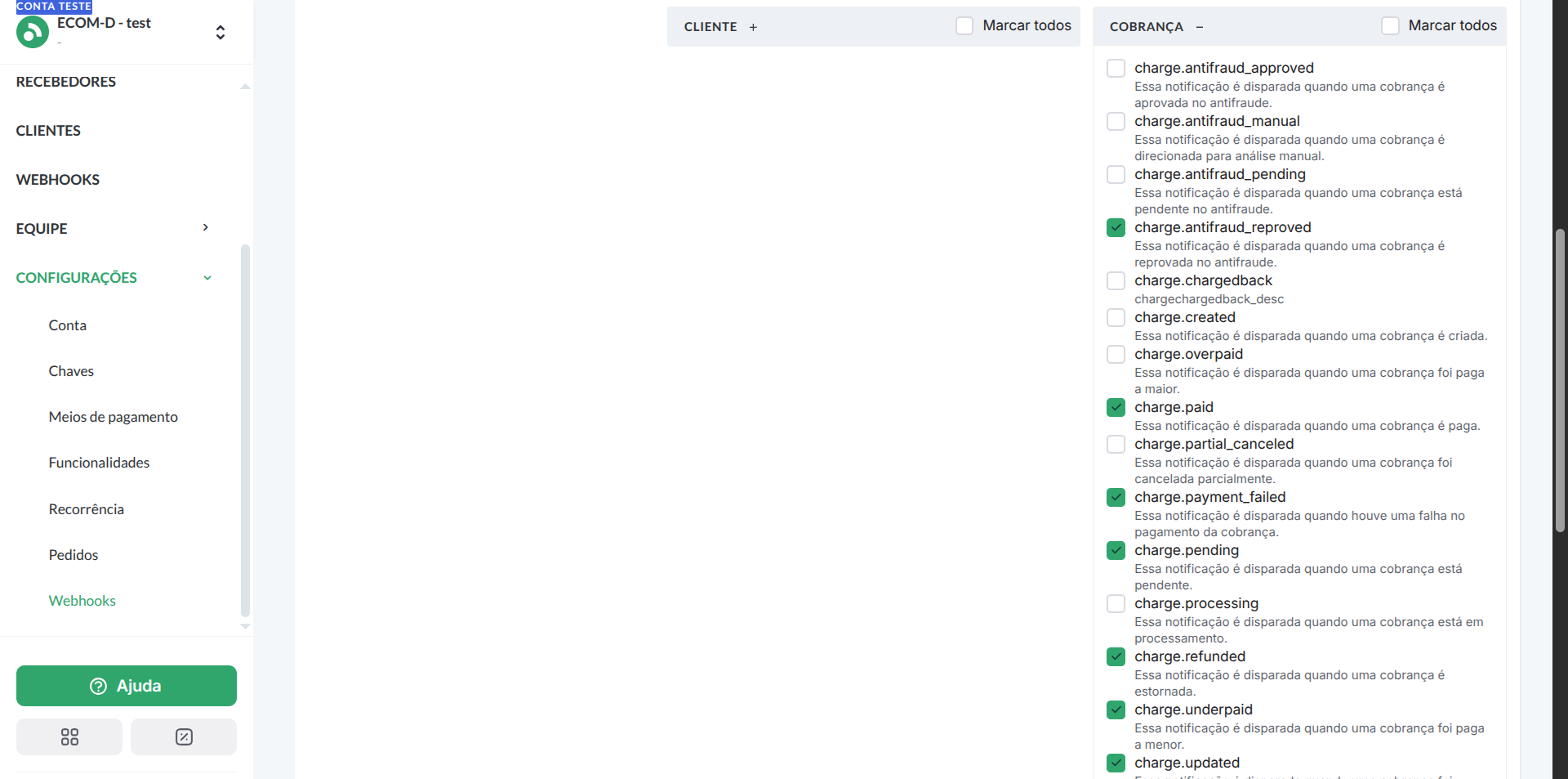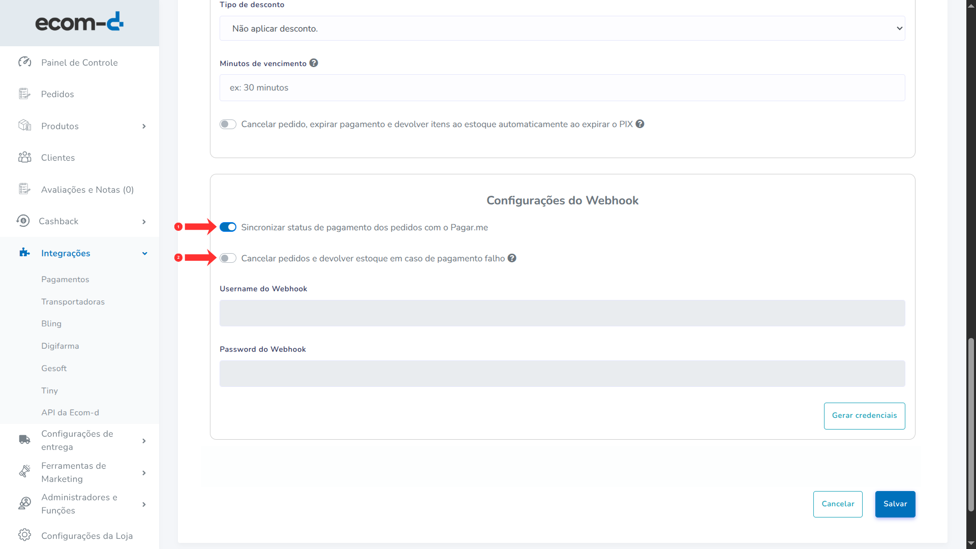 - Neste campo, você pode habilitar o webhook do Pagar.me na plataforma Ecom-d.