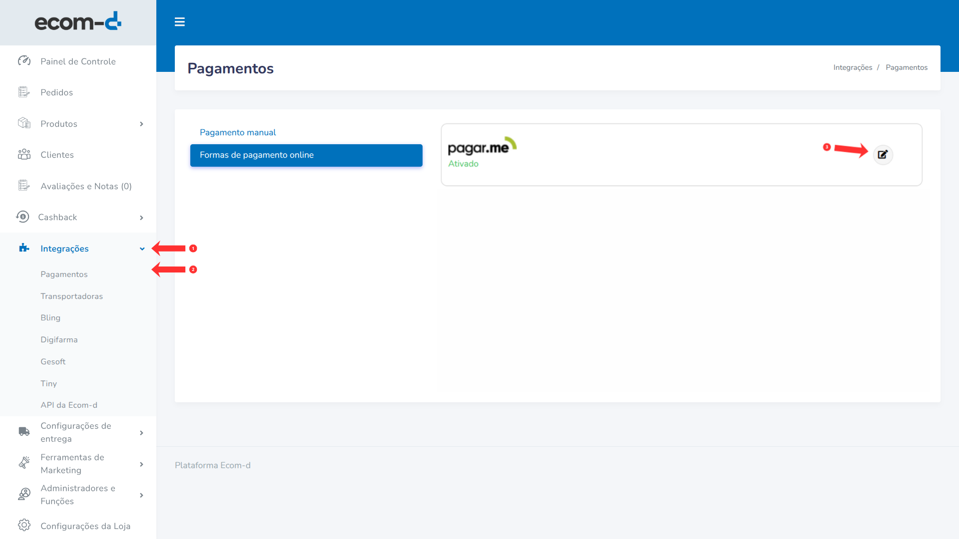 Na plataforma Ecom-d, você deve acessar as configurações da integração com o Pagar.me.