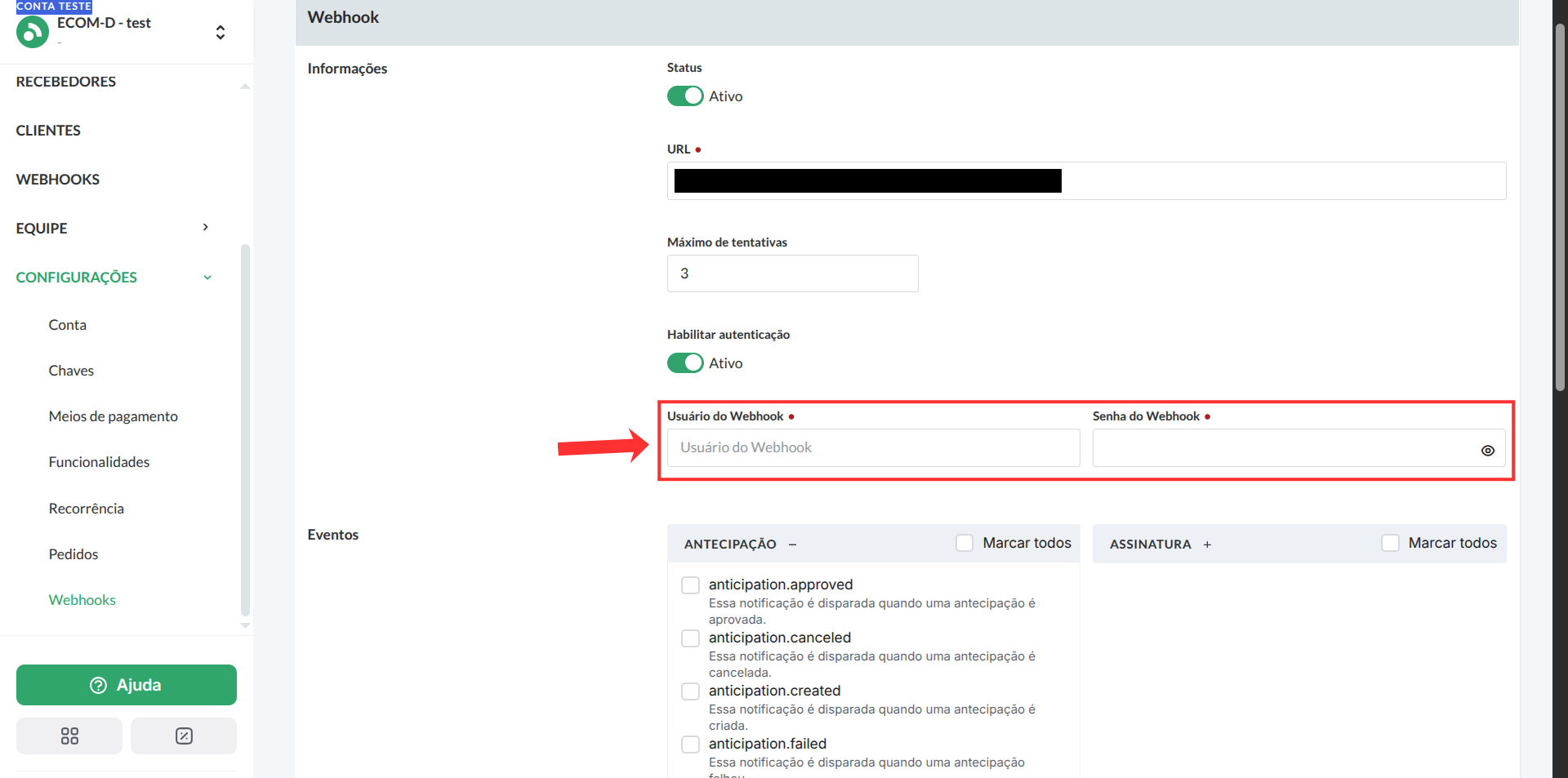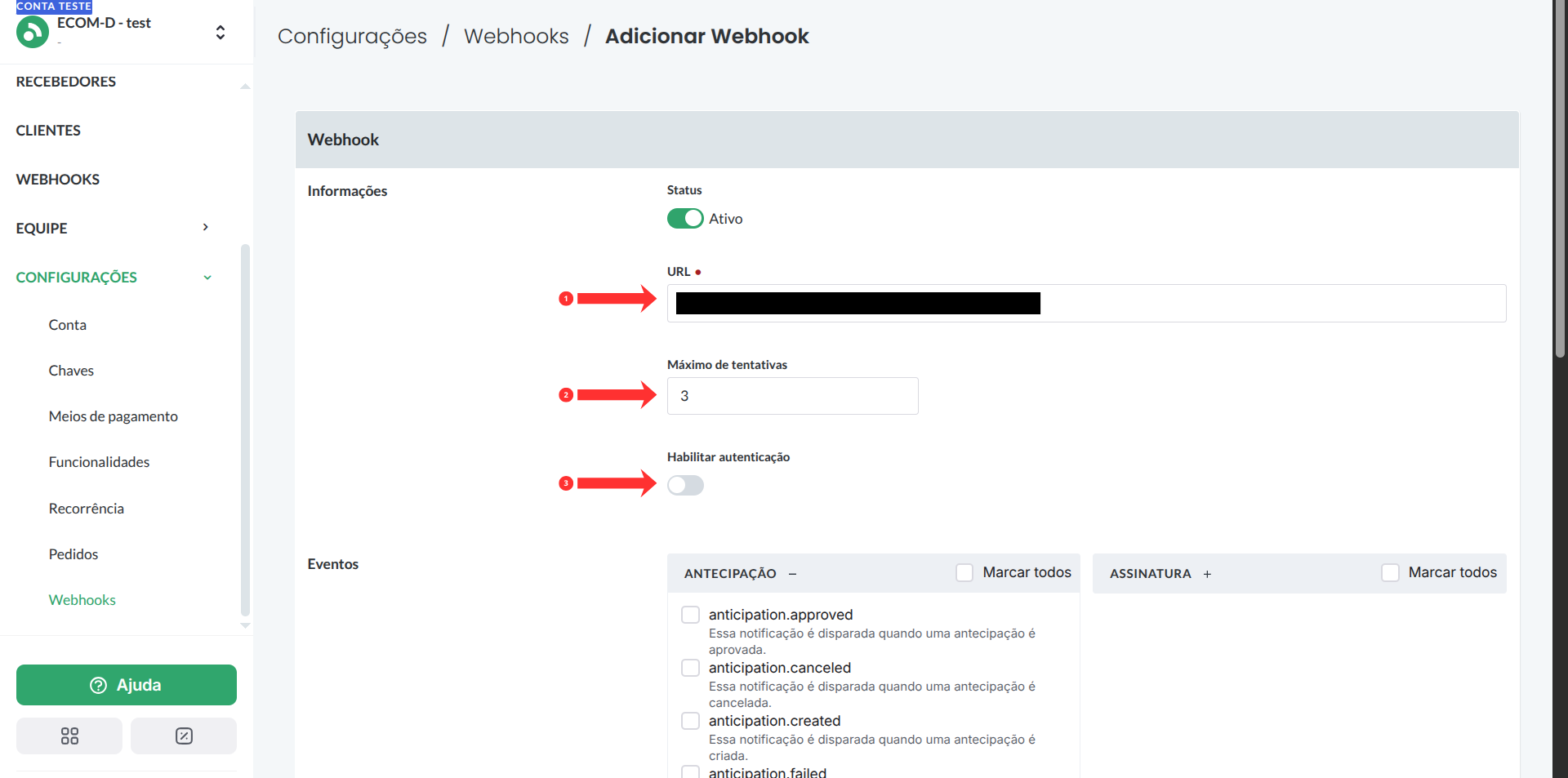 Importante: certifique-se de incluir o prefixo https:// na URL. Sem ele, os eventos do webhook não funcionarão corretamente.